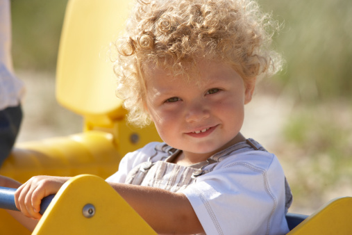 Toddler boy (2-4) sitting in playground ride, smiling, portrait